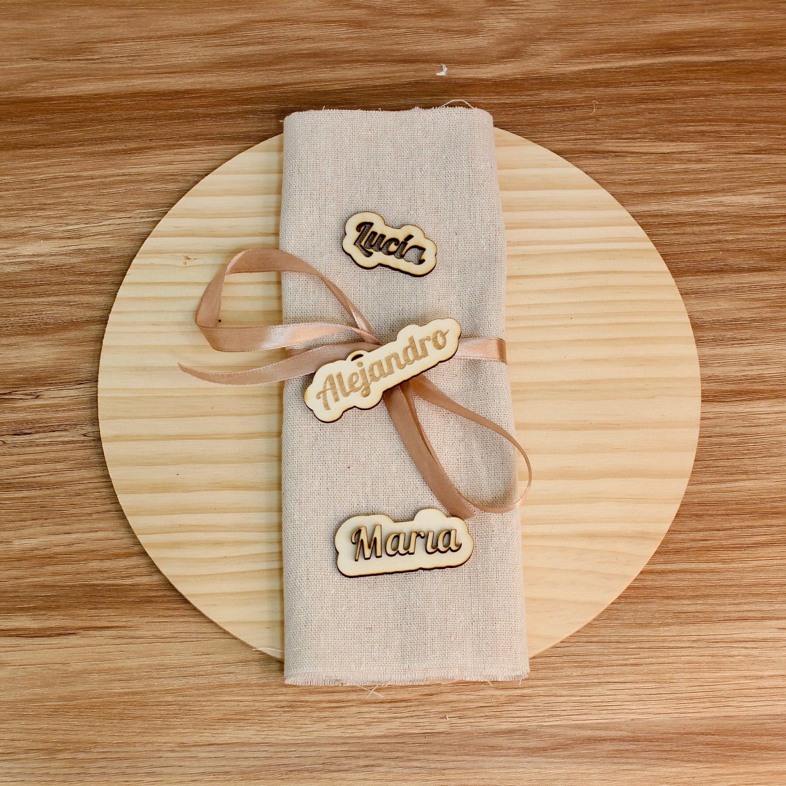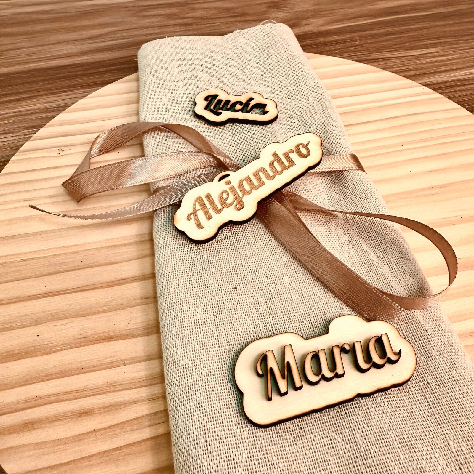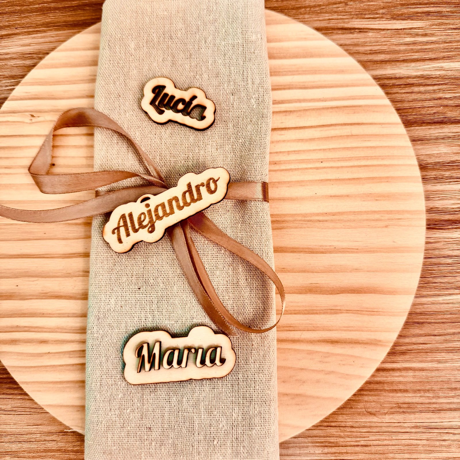 Da un toque original, elegante y completamente único a tu evento con nuestros marcasitios de madera personalizados con nombre. Fabricados en madera natural y disponibles en tres estilos artesanales: