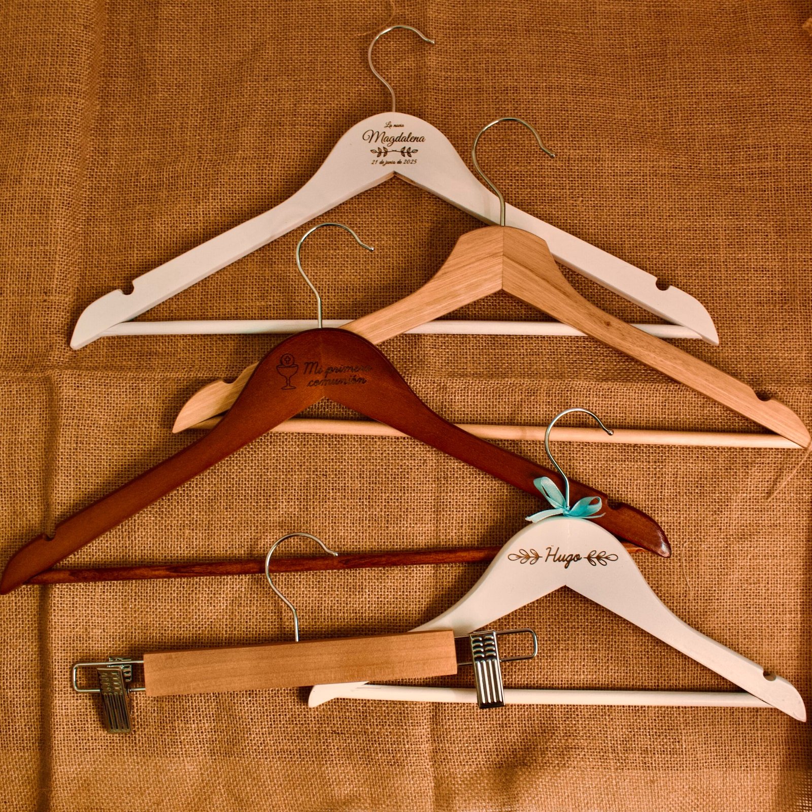 Añade un toque único y elegante a cualquier evento con nuestra percha de madera personalizada. Fabricada en madera natural y grabada con láser con el nombre, fecha o rol (novia, madrina, padrino, etc.), esta percha es el detalle perfecto para bodas, comuniones, bautizos o regalos especiales.