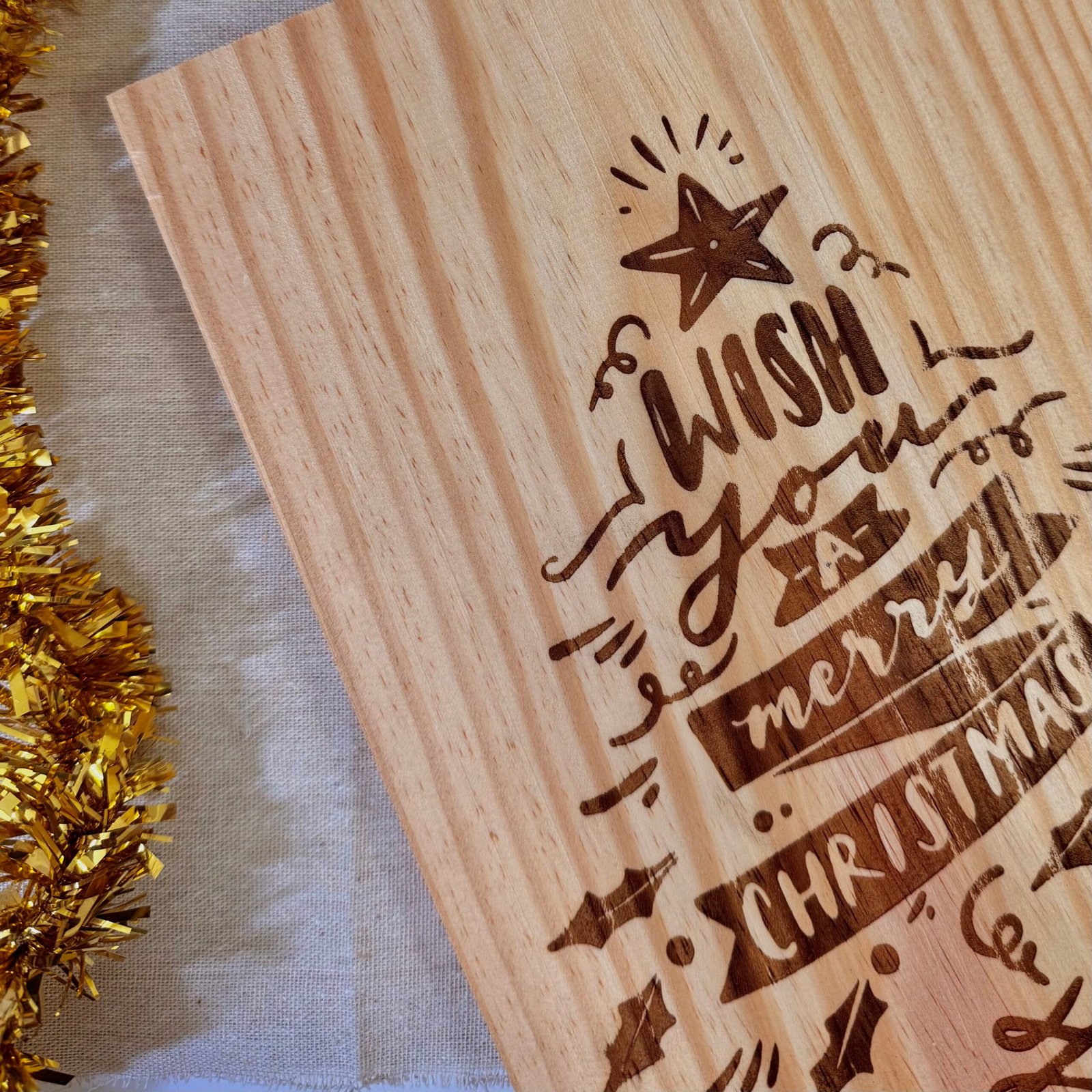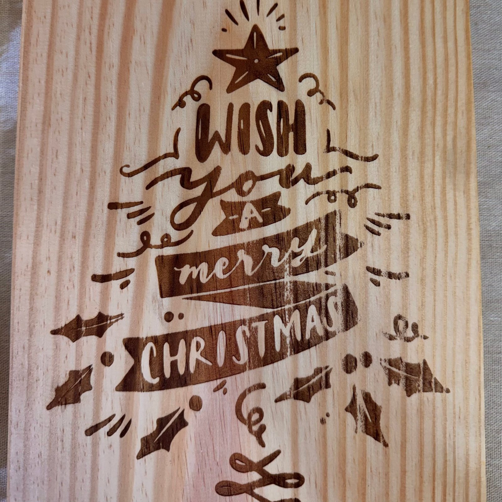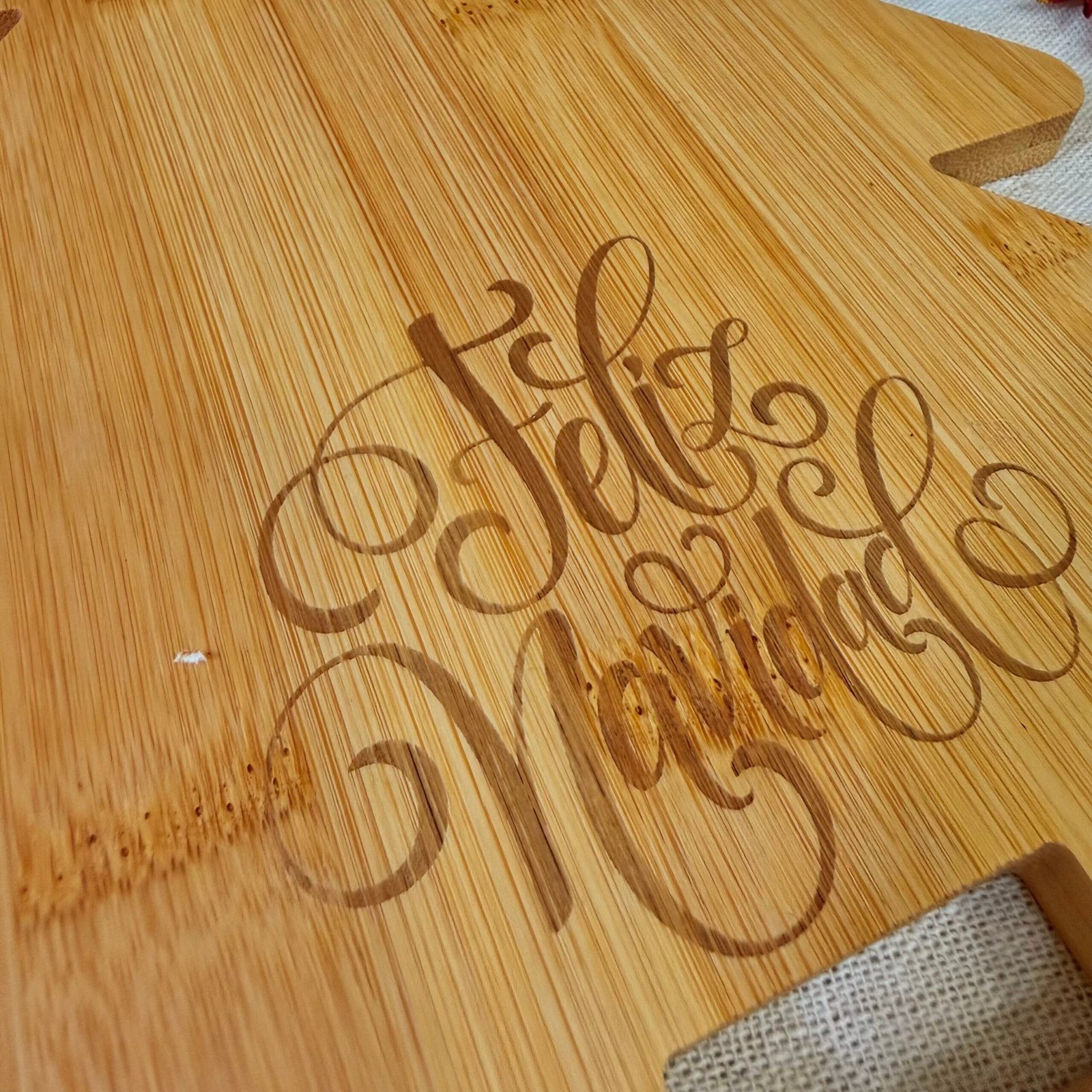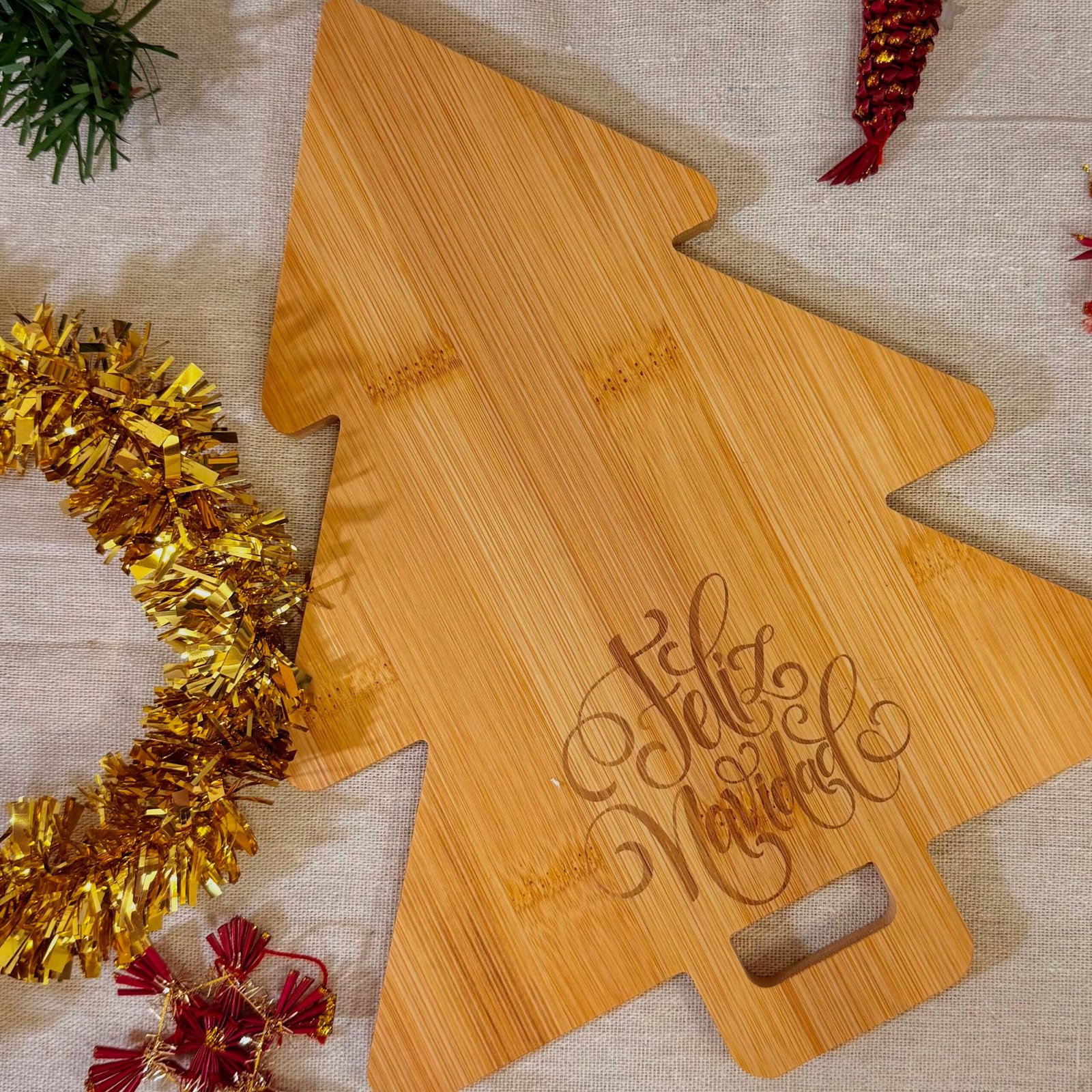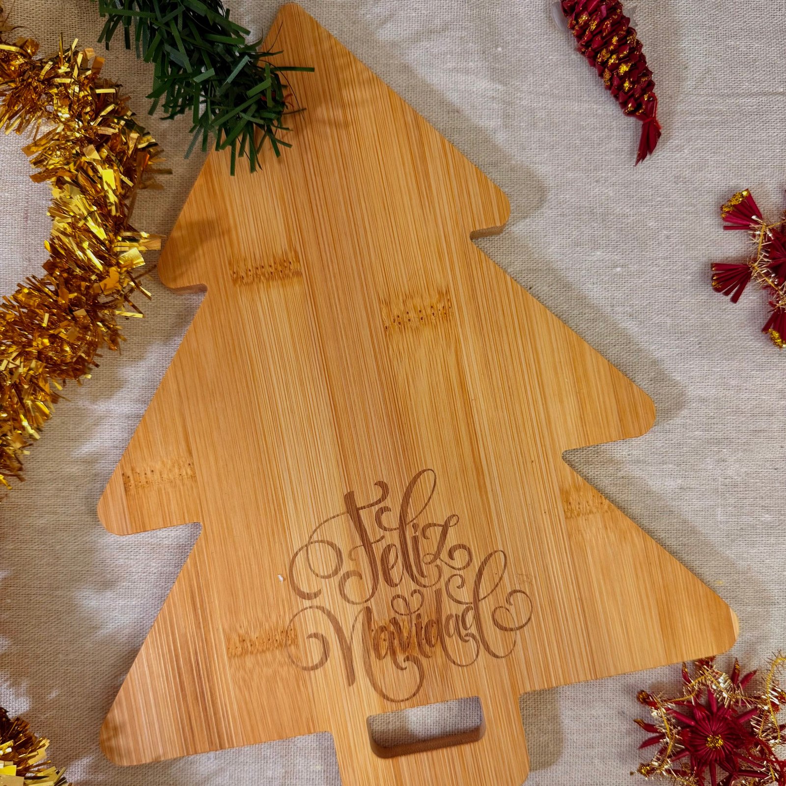 Celebra la Navidad con estilo y funcionalidad gracias a nuestra tabla de cortar o servir en forma de árbol, fabricada en madera natural y grabada con dibujos y frases navideñas.